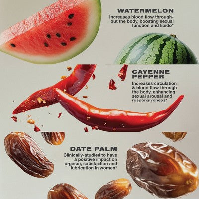 Enhances intimacy by improving sexual arousal, reducing anxiety, and supporting an elevated sex drive through improved blood circulation and energy levels for women ages 18-64, and formulated with vegan ingredients watermelon, date palm, and cayenne pepper.
