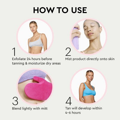 Exfoliate 24 hours before tanning. Moisturize dry areas such as hands, feet, knees, ankles and elbows prior to application. Mist products directly onto skin, blending lightly with mitt. Your tan will develop within 4-6 hours.