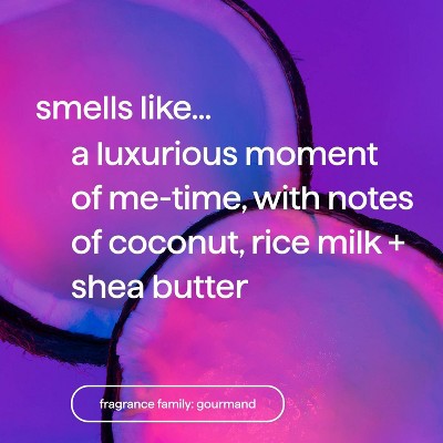 this comforting fragrance trifecta of coconut, rice milk + shea butter whisks you away to a land of cozy fireplaces, chunky socks + big bowls of creamy dessert. mmm, dessert.
