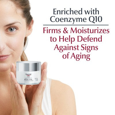 Eucerin Q10 Anti-Wrinkle Face Cream is formulated to help protect against the damaging effects of free radicals, and firms and moisturizes for softer, smoother looking skin. This anti wrinkle face moisturizer helps to reduce the look of fine lines and wrinkles in as little as 5 weeks (after twice daily usage). Enriched with antioxidants, Vitamin E and Beta-Carotene, this anti wrinkle face cream for sensitive skin can be used alone or under make-up. This Eucerin Q10 Anti-Wrinkle Face Cream is fragrance, alcohol and dye free, and is non-comedogenic. This Eucerin daily facial moisturizer can be used alone or under make-up as a hydrating base. To use, apply this Eucerin cream face moisturizer to the face and neck area in the morning and evening. Eucerin is a dermatologist-recommended skincare brand that is based on an uncompromising approach to science.