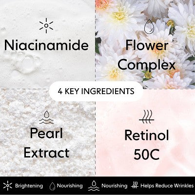 Like a multi-vitamin for your eye area. Niacinamide, or vitamin B3, encourages ceramide synthesis, promoting brighter, more resilient-looking skin. Retinol, a form of vitamin A, increases cell turnover to minimize the look of fine lines and wrinkles. Pearl extract delivers immediate radiance, while our flower complex calms and soothes the delicate skin around the eye area.