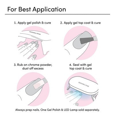 For the chrome finish to appear seamless, ensure gel polish is not pooling in any area of the nails before curing. An even coat of gel polish will help the polish last.