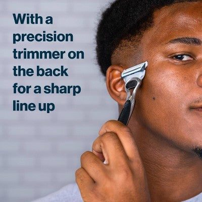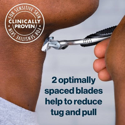 Gillette SkinGuard Razor Blades with a patented irritation defense bar, designed specifically for sensitive skin. SkinGuard revolutionizes the process of shaving by making shaving at home more enjoyable, including for men who are prone to skin sensitivity and irritation while shaving. Each blade cartridge features two sharp, optimally-spaced blades that work together to minimize tugging and pulling. Unlike most blades that cut hairs below ths skin, SkinGuard's revolutionary "guard" technology gently positions the blades to cut hairs at skin level, helping to prevent new razor bumps and shaving irritation.This specialized technology is clinically proven for users with senstive skin, providing a clean, comfortable shave. Gillette SkinGuard blades allow for the ideal blend of closeness and comfort, helping to protect against shave-related irritations. The lubrication, with a touch of aloe, is strategically placed both before and after the blades, delivering maximum comfort with every stroke. Additionally, the precision blade on the back of the cartridge allows you to perfect your lines and achieve a sharp, well-groomed look. This pack of blade refills fits all Gillette SKINGUARD, FUSION5, PROGLIDE, AND PROGLIDE SHIELD razor handles.Experience the confidence that comes with "the best a man can get": a shave that's as easy as it should be-comfortable, smooth, and clean. To help prevent new razor bumps, ingrown hairs, and shaving irritation, use the Gillette SkinGuard regimen.