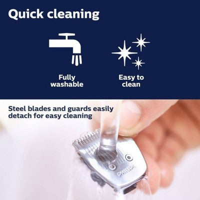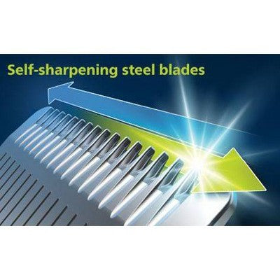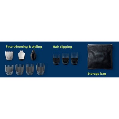 The Philips Norelco Multigroom 3000 is an all-in-one trimmer with everything you need, and nothing you don't. Our toughest multipurpose trimmer boasts self-sharpening steel blades that never need blade oil. The trimmer includes 13 pieces to trim your face, head and hair, including a full-size stainless steel trimmer, steel detailer, nose and ear trimmer, 3 hair cutting guards, 3 beard trimming guards, 1 stubble trimming guard, and a storage bag. The durable trimmer includes impact-resistant cutting guards, a steel reinforced motor, and a powerful battery delivering 60 minutes of run time. The blades and guards can be rinsed clean, and the device comes with a 45 day risk-free trial and a full 2-year warranty. 13 pieces for all of your grooming needs: Beard and stubble trimming and maintenance, precision trimmer allows exact placement for sharp lines, nose and ear trimmer taking care of unwanted hairs. Self-sharpening steel blades remain sharp as day one for long lasting performance, no blade oil required. Easily clean blades and guards by detaching from handle and rinsing under water. Unlike competition, no blade oil needed to maintain high quality performance. Powerful battery delivers up to 60 minutes of run time. Standard blade is 32mm wide. Includes: Groomer, full-metal trimmer blade, a full-metal detailer blade, a nose and ear hair trimmer, 3 hair trimming guards, 3 beard trimming guards, a stubble guard, a storage bag, and a cleaning brush. Packaging switched from plastic to paper. Shop products with packaging that's designed to reduce waste. Together, we're creating packaging solutions that are designed from recycled or renewable materials. Packaging uses plastic alternative such as FSC-certified paper, aluminum, steel, or glass with great potential to be widely circular for majority of product packaging. This item's packaging is made with up to 97% plastic alternative materials. Two Year Warranty.