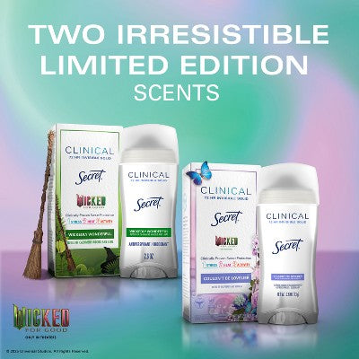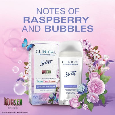 Sweat happens everywhere- Secret Clinical Invisible Solid Antiperspirant & Deodorant handles sweat with the formula you love, in two new irresistible, limited-time scents, inspired by the magic of Elphaba and Glinda. Couldn't be Lovelier's Notes of Raspberry and Bubbles will keep you fresh and smelling enchanting, so you can take on whatever comes your way and are protected against 3 types of sweat 1) stress, 2) heat, and 3) activity sweat. Experience the reliable freshness and protection of Secret Clinical Strength Antiperspirant and Deodorant and embrace your day without worry.