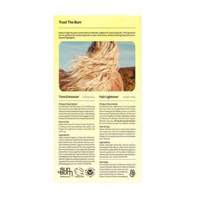 Hair Lightener: Our Hair Lightener is specifically formulated to brighten our hair by amplifying the natural highlighting effects of the sun. Infused with pineapples and honey, our special UV-activated blend creates natural subtle tones and beautiful highlights without brassiness. We're stoked to share one of our best secrets with you. While we like using straight lemon and pineapple juice to lighten our hair, we've added a little hydrogen peroxide to give us faster results. We didn't feel good about bottling straight citrus juice and charging you for it, so if you want to go au naturel, pick some lemons off your neighbor's tree and squeeze the juice into your hair, old school.And yes, the blonde results are permanent.Tone Enhancer: Our Blonde Tone Enhancer leave in treatment helps remove brassiness to bring out cooler blonde tones while also hydrating and conditioning hair. It helps control frizz and slows color fading, and will leave your hair silky smooth and shiny. Perfect for natural and color treated blonde hair.